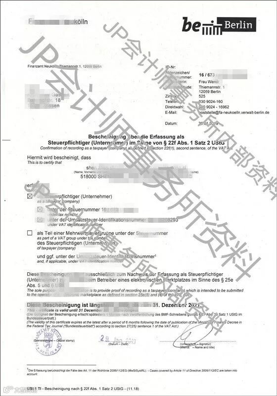 但J&P创始人Julia表示,一般情况下,申请德国税务证书副本需要20个工作日左右,现在申请已经赶不上3月1日的最后期限。