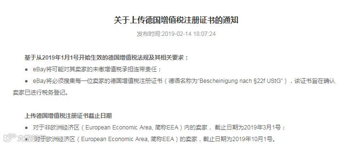 2、eBay要求卖家应德国增值税新规在2019年前上传德国增值税证书(如下图):