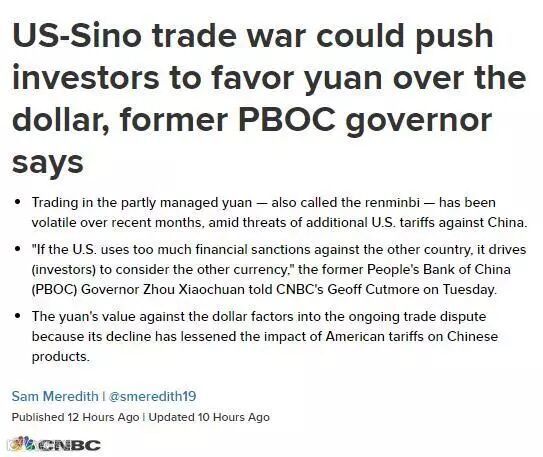 今晨,美国CNBC也发文称,前央行行长周小川在接受采访时表示,中美贸易战可能会令投资者更倾向于人民币而不是美元。