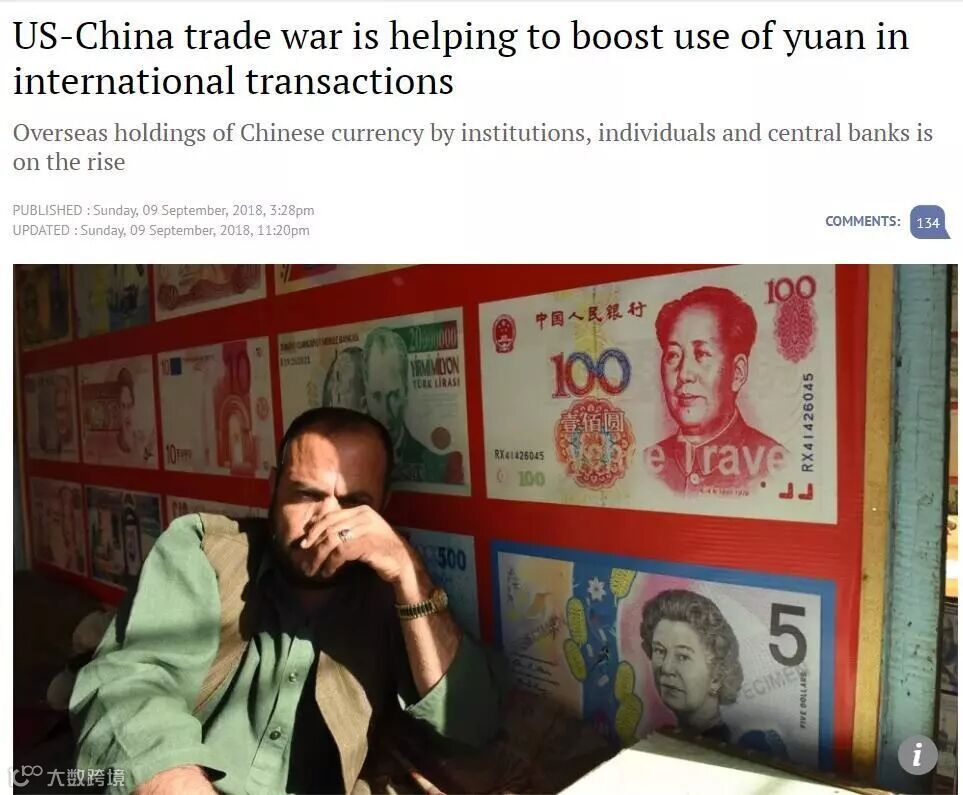 ▲《南华早报》报道截图:“中美贸易战正帮助中国提升人民币在国际交易中的使用”。