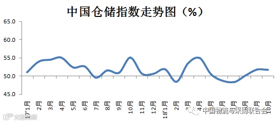 中国物流与采购联合会发布的2018年10月份中国物流业景气指数为54.5%,较上月回升1.4个百分点;中国仓储指数为51.7%,较上月回落0.1个百分点。