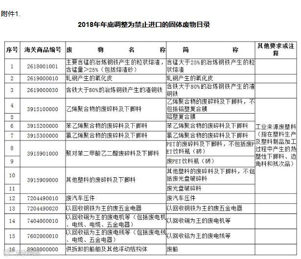 附件:1.2018年年底调整为禁止进口的固体废物目录