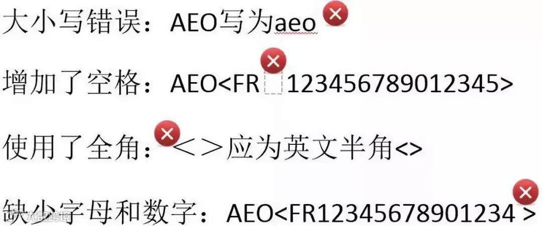 1. 英文字母要大写半角格式,AEO正确,aeo错误;