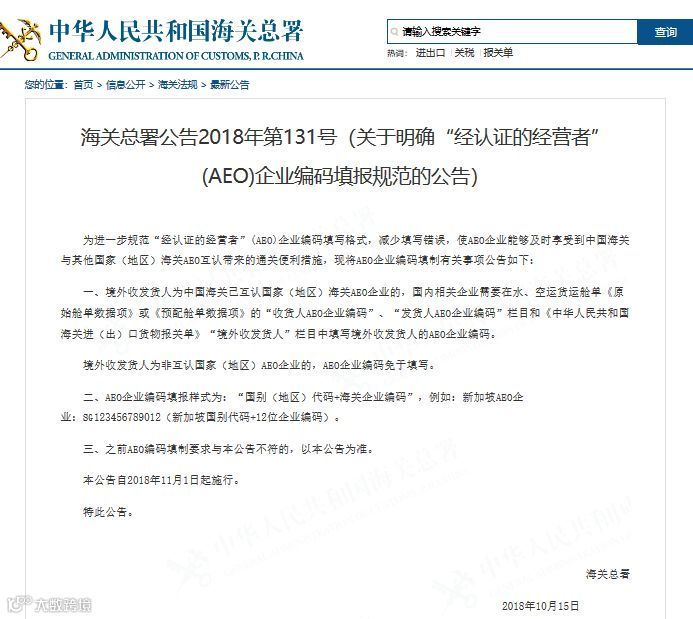 近日,海关总署发布《关于明确“经认证的经营者”(AEO)企业编码填报规范的公告》,境外收发货人填写又有新规定了,之前AEO编码填制要求与本公告不符的,以本公告为准。本公告自2018年11月1日起施行。
