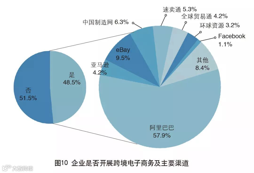 本次调查显示, 企业已开展跨境电商的选择比例为48.5%,这是自2016年该项被加入至调查以来连续第3年提高,2016年和2017年选择比例分别是37.3%、44.3%。在第三方跨境电商平台中,外贸企业选择阿里巴巴的比例最高,为57.9%;接着是eBay、中国制造网、速卖通、亚马逊、全球贸易通、环球资源和Facebook,选择比例分别是9.5%、6.3%、5.3%、4.2%、4.2%、3.2%、1.1%;选择“其他”的比例为8.4%(见图10)。