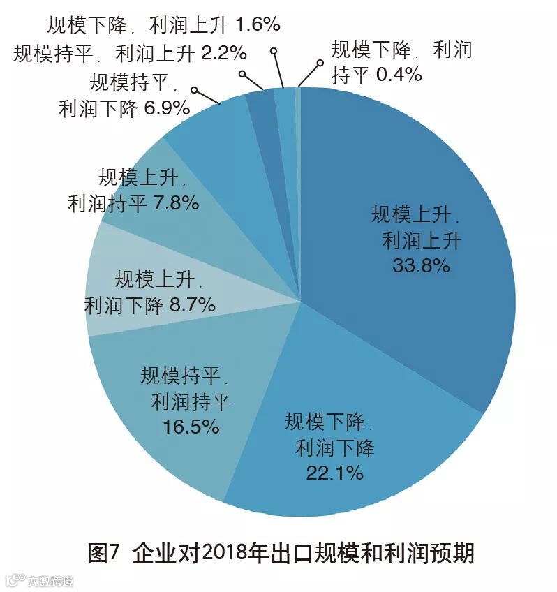 可喜的是,在对2018年出口预期调查中,企业选择“规模上升,利润上升”的比例最高,为33.8%,与2017年持平(见图7)。可见,虽然当前贸易摩擦、关税壁垒和局部地区动荡等因素令外贸企业十分烦恼,但对未来1年出口形势充满信心的企业也不在少数。