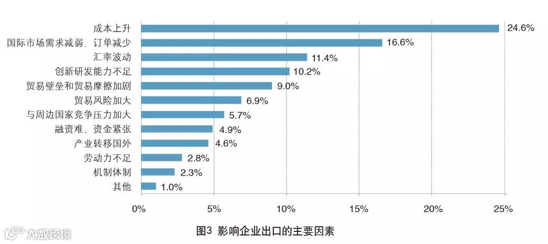 过去多年, “ 国际市场需求减弱、订单减少”“成本上升”和“自身创新研发能力不足”一直是影响企业出口的前三大因素,直到2017年,“成本上升”超过“国际市场需求减弱、订单减少”,成为影响出口的最大因素,但前3名仍然是以上几项。