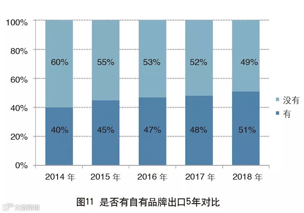 从2014~2018年连续5年的调查结果看,选择拥有自主品牌的企业占比一直在提高,分别是40%、45%、47% 、48%和51%(见图11)。本次调查结果意味着拥有自主品牌的企业已占据半壁江山,预计这一趋势还会继续扩大。
