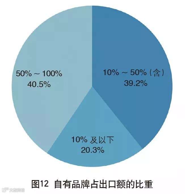 在“自有品牌占出口额的比重”调查项中,选择自有品牌占出口额比重超过50%的企业最多,达到40.5%;选择自有品牌占出口额比重在10%~50%(含)之间的企业比例为39.2%;自有品牌占出口额比重少于10%的企业仅占20.3%(见图12)。
