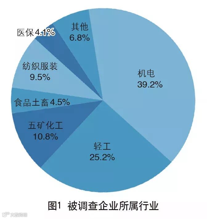本次调查共收到1231家外贸出口企业的反馈。分行业看,机电行业企业最多,占39.2%;接着是轻工行业企业占25.2%,五矿化工行业企业占10.8%,纺织服装行业企业占9.5%,食品土畜行业企业占4.5%,医保行业企业占4.1%,其他行业企业占6.8%(见图1)。