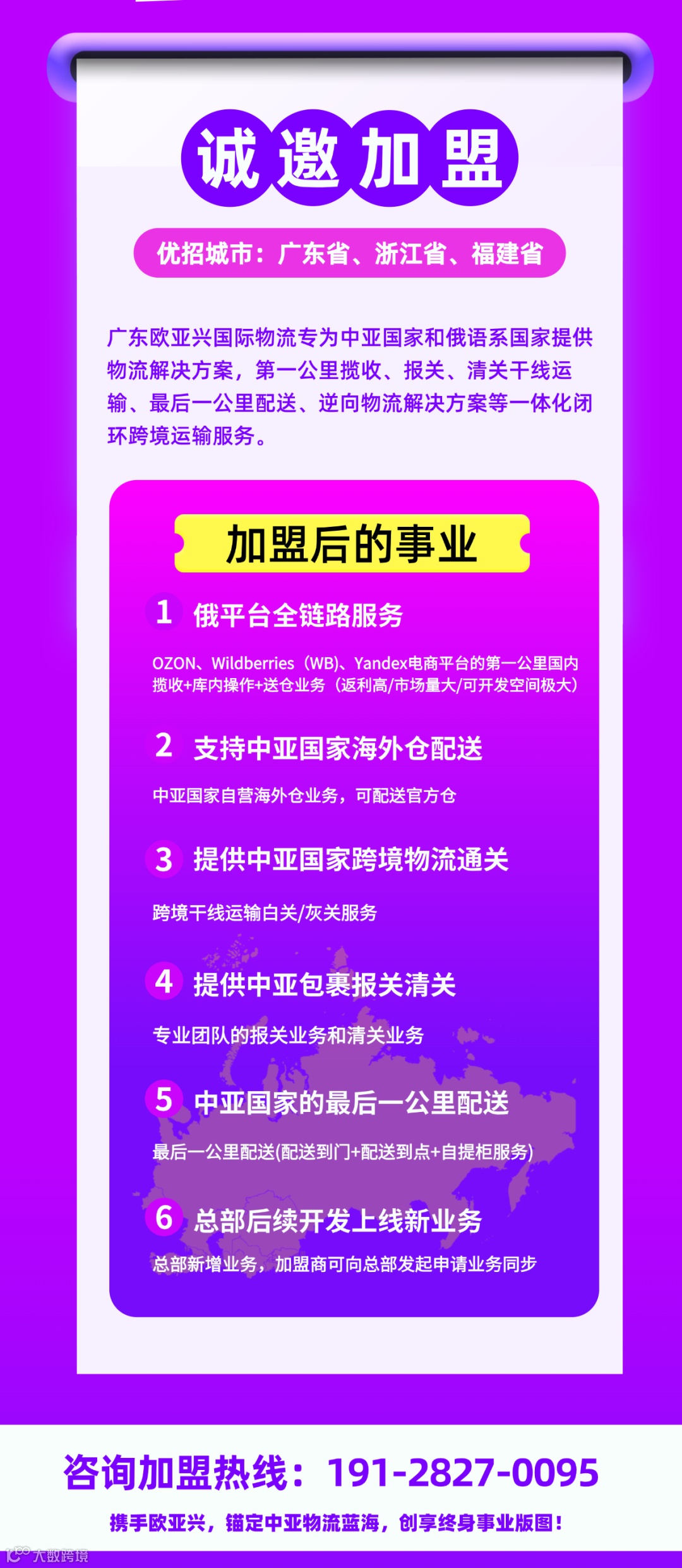 广东欧亚兴国际物流专为中亚国家和俄语系国家提供物流解决方案:第一公里揽收、报关、清关干线运输、最后一公里配送、逆向物流解决方案等一体化闭环跨境运输服务。