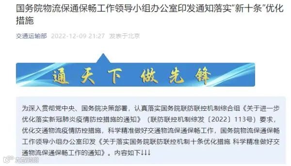 国务院物流保通保畅工作领导小组办公室9日晚发布《关于落实国务院联防联控机制十条优化措施 科学精准做好交通物流保通保畅工作的通知》,要求全面取消货运车辆闭环管理要求,各地不得随意层层加码,限制货运车辆跨区域通行。