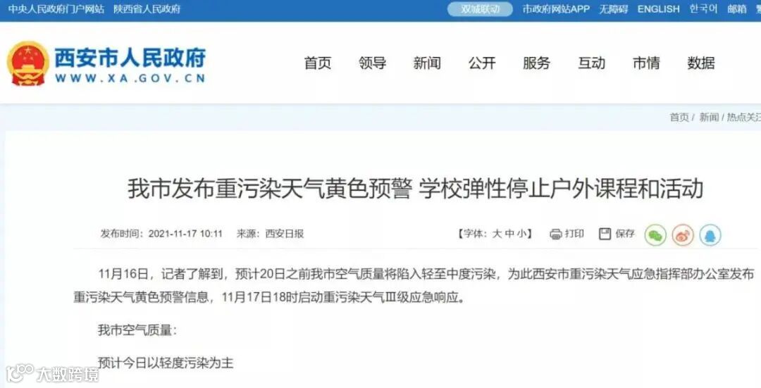 2021年11月16日19时,西安市于发布重污染天气黄色预警信息,并启动重污染天气Ⅲ级应急响应。
