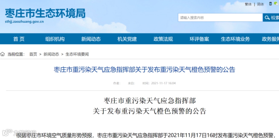 2021年11月17日16时,枣庄市发布重污染天气橙色预警,并启动重污染天气Ⅱ级应急响应。