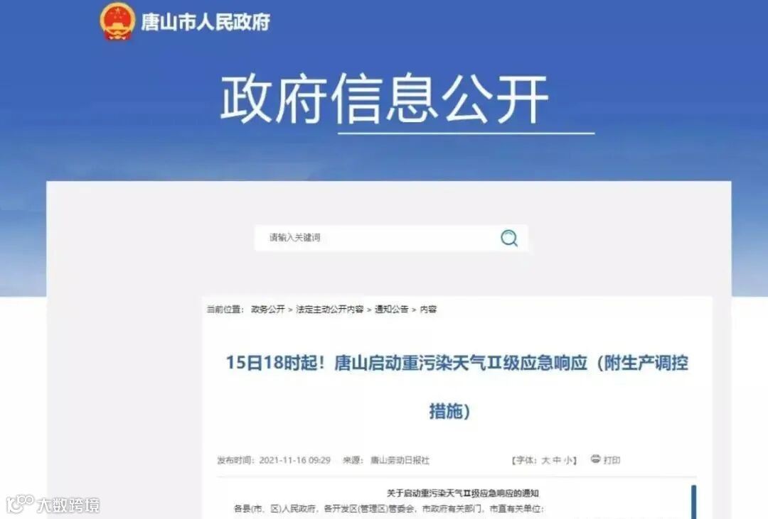 2021年11月15日18时,唐山市全市启动重污染天气Ⅱ级应急响应。