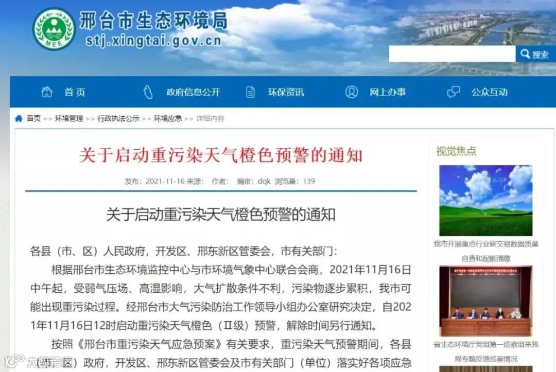 2021年11月16日12时,邢台市启动重污染天气橙色(Ⅱ级)预警。
