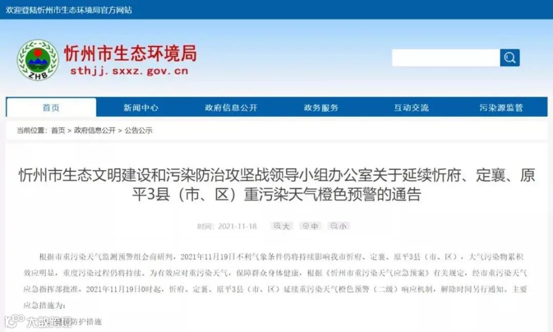 2021年11月19日0时起,忻府、定襄、原平3县(市、区)延续重污染天气橙色预警(二级)响应机制。