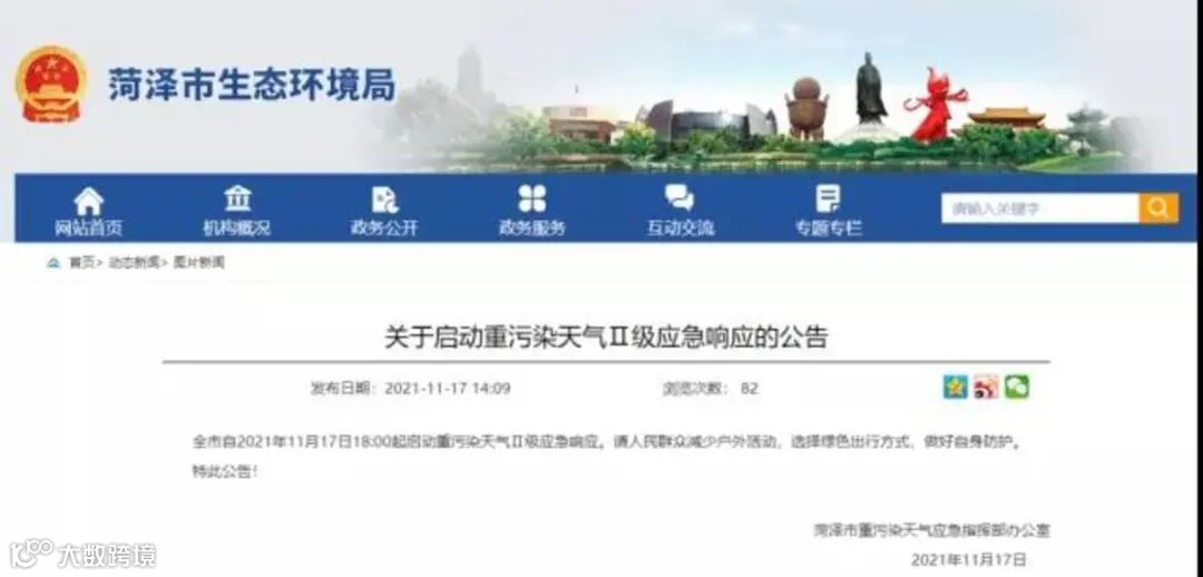 2021年11月17日12时,荷泽市发布重污染天气橙色预警,并启动Ⅱ级应急响应。