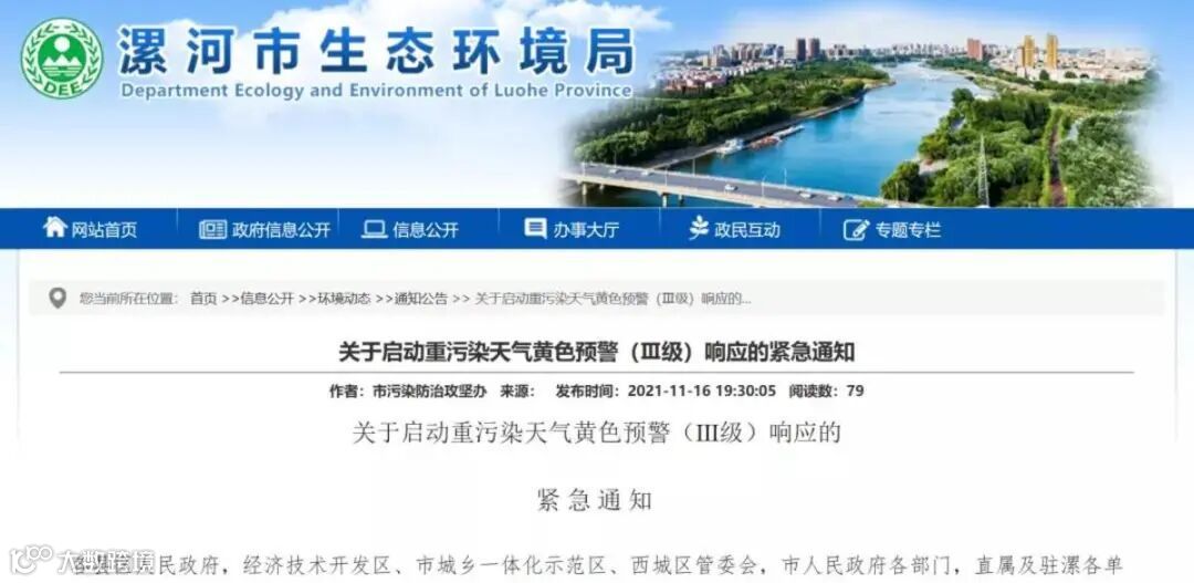 自11月16日20时起,漯河市在全市范围内启动重污染天气黄色预警(Ⅲ级)应急响应。