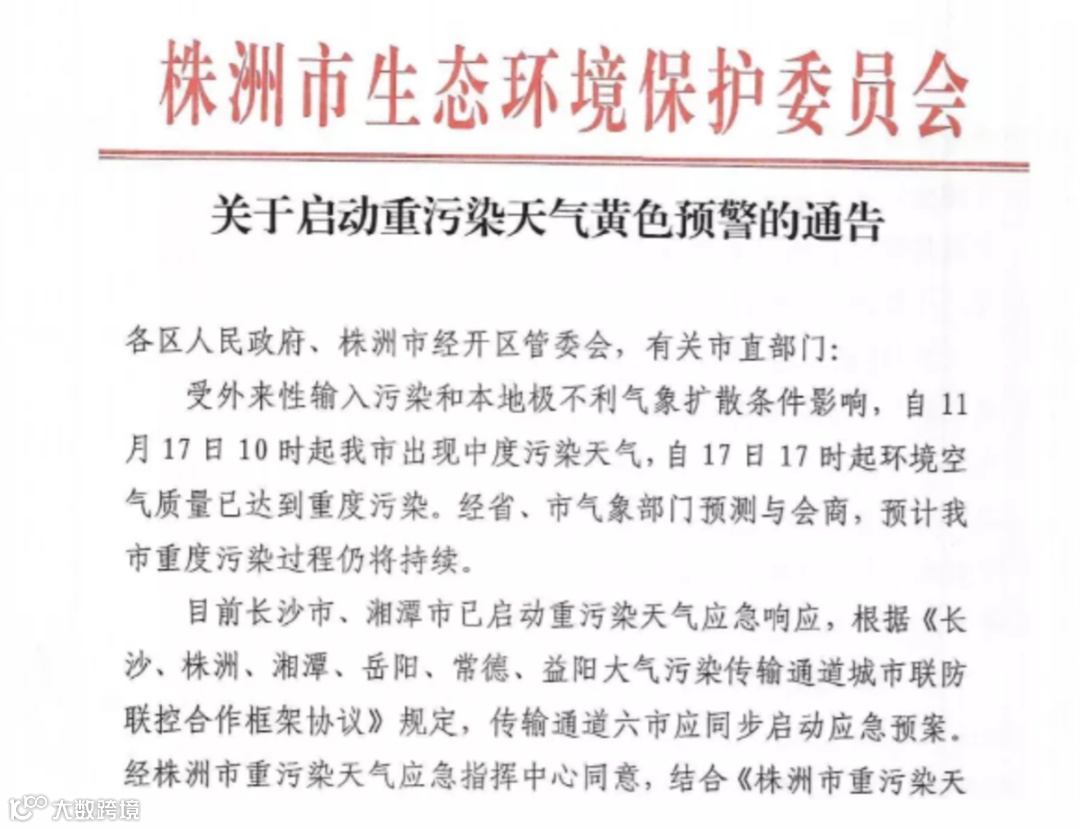 2021年11月17日21时起,株洲市启动重污染天气黄色预警,同时启动黄色Ⅲ级响应措施。