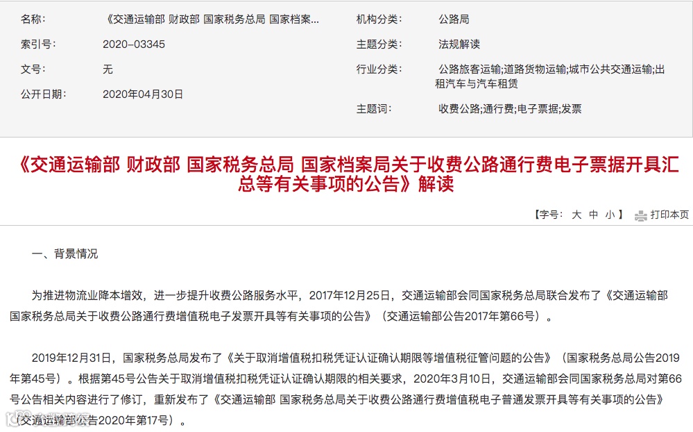 为进一步提升收费公路服务水平,规范收费公路通行费电子票据开具,便利ETC客户和受票单位电子票据财务处理,4月27日,交通运输部会同财政部、国家税务总局、国家档案局印发《关于收费公路通行费电子票据开具汇总等有关事项的公告》(简称《公告》),优化完善了收费公路通行费电子票据开具相关流程,实现了“多次通行,一次汇总,电子票据打包下载,无纸化报销归档”。
