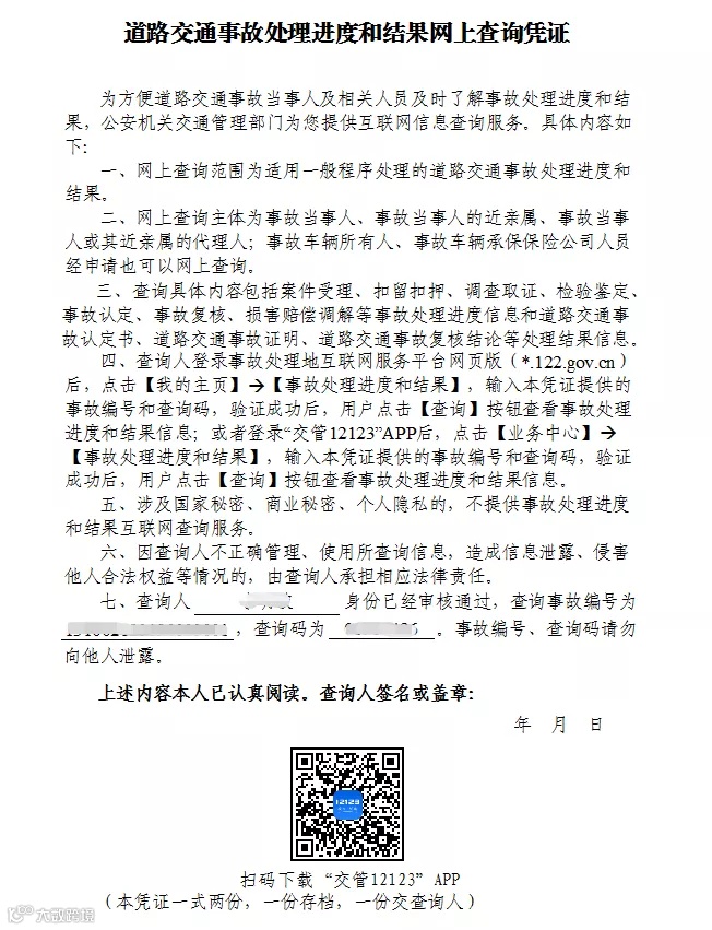 查询主体可以通过登录 “交管12123”APP或者互联网平台网页版(*.122.gov.cn),输入查询凭证提供的事故编号和查询码进行查询。