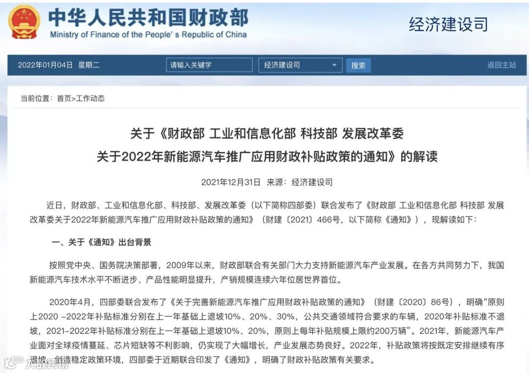 2021年12月31日,财政部、工业和信息化部、科技部、发改委发布《关于2022年新能源汽车推广应用财政补贴政策的通知》。
