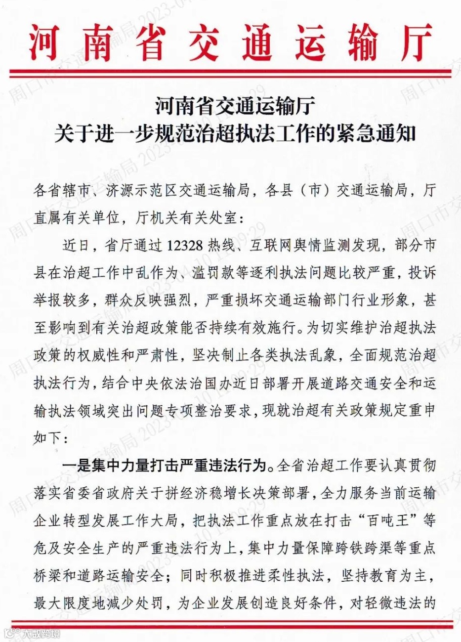 近日,由于部分市县在治超工作中乱作为、滥罚款等逐利执法问题比较严重,投诉举报较多,群众反映强烈,河南省交通运输厅发布《关于进一步规范治超执法工作的紧急通知》,对治超相关政策规定进行重申,具体内容要点如下: