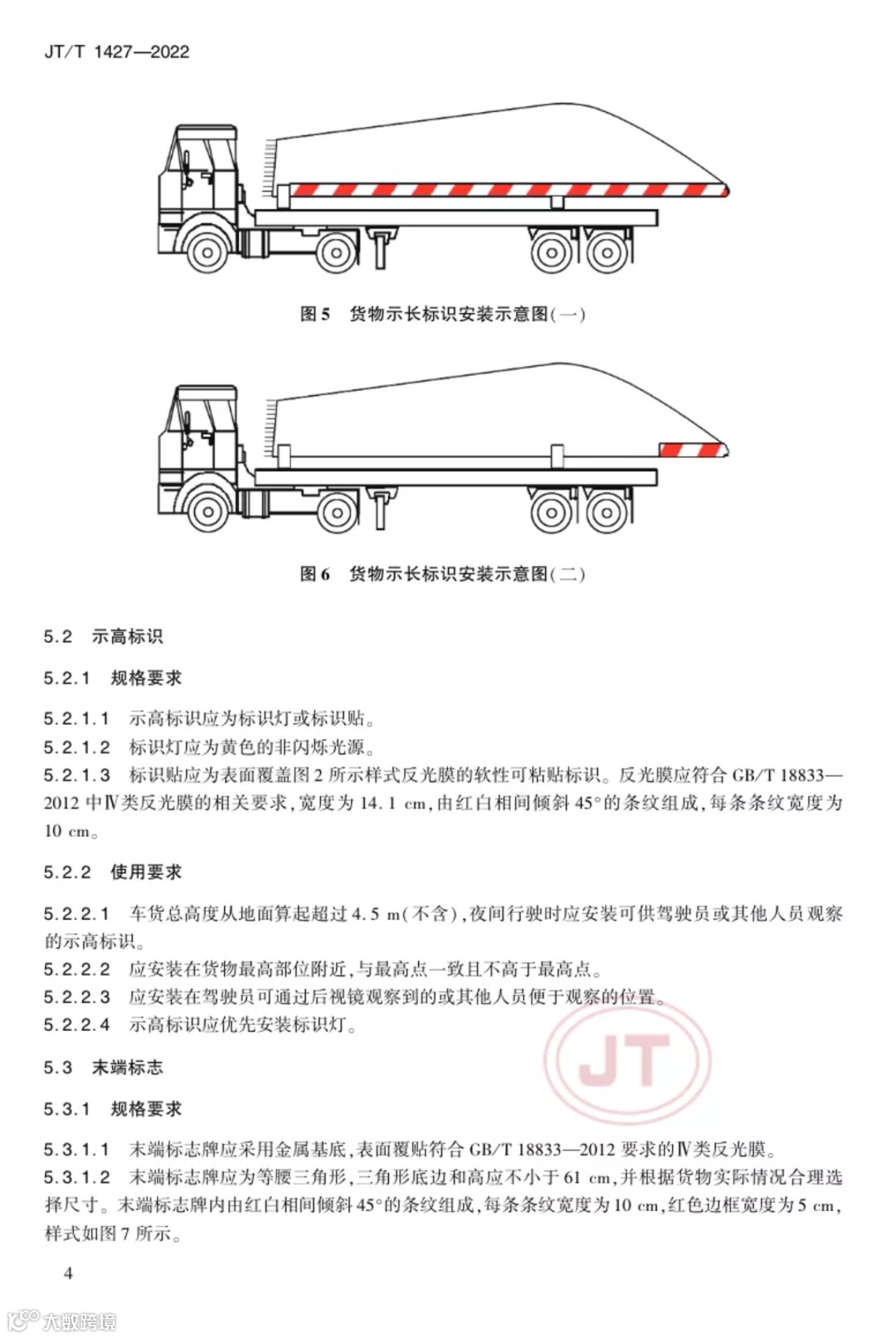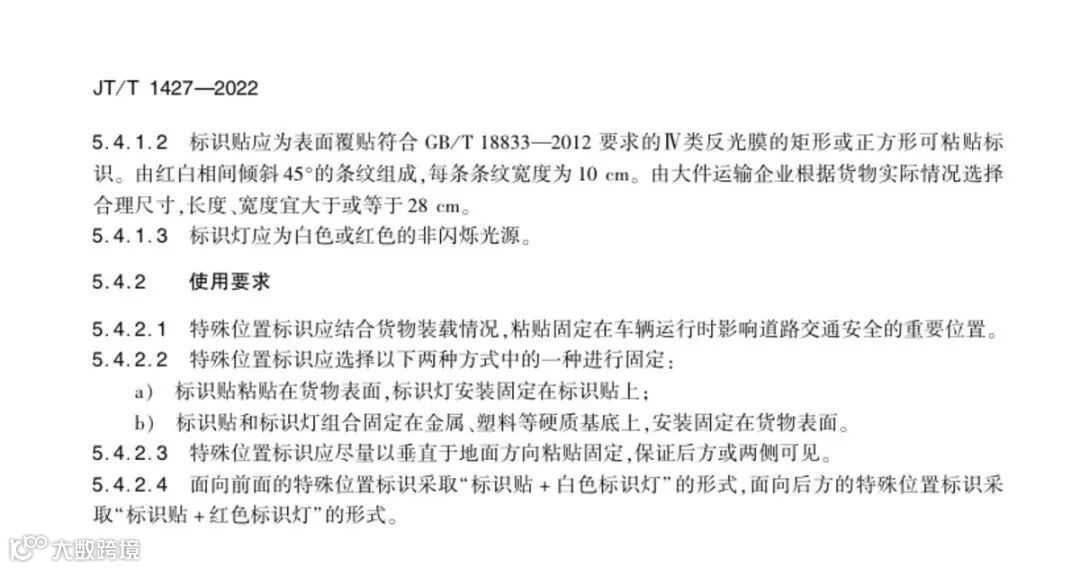 车辆前部标志、车身标志标识的相关规定以及货物示宽示长标识、示高标识、末端标志、特殊位置标识的规格要求和使用要求等