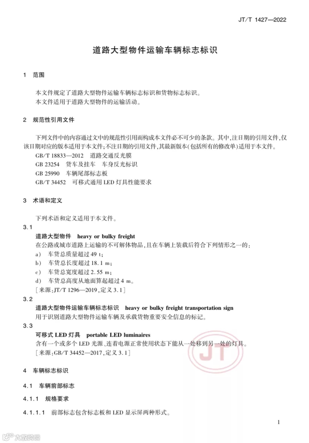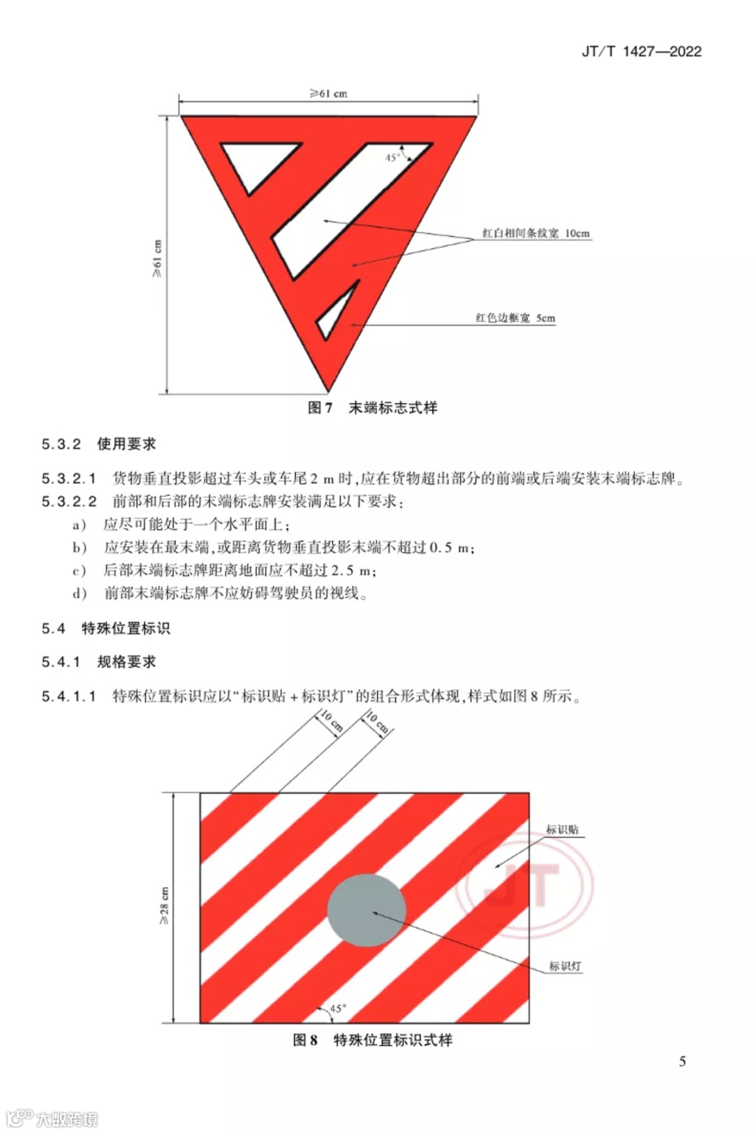 是用于识别道路大型物件运输车辆及承载货物重要安全信息的标记。道路大型物件运输是我国道路货物运输的重要组成部分,由于车辆本身或装载后车货尺寸、重量超限,道路大型物件运输车辆具有行驶