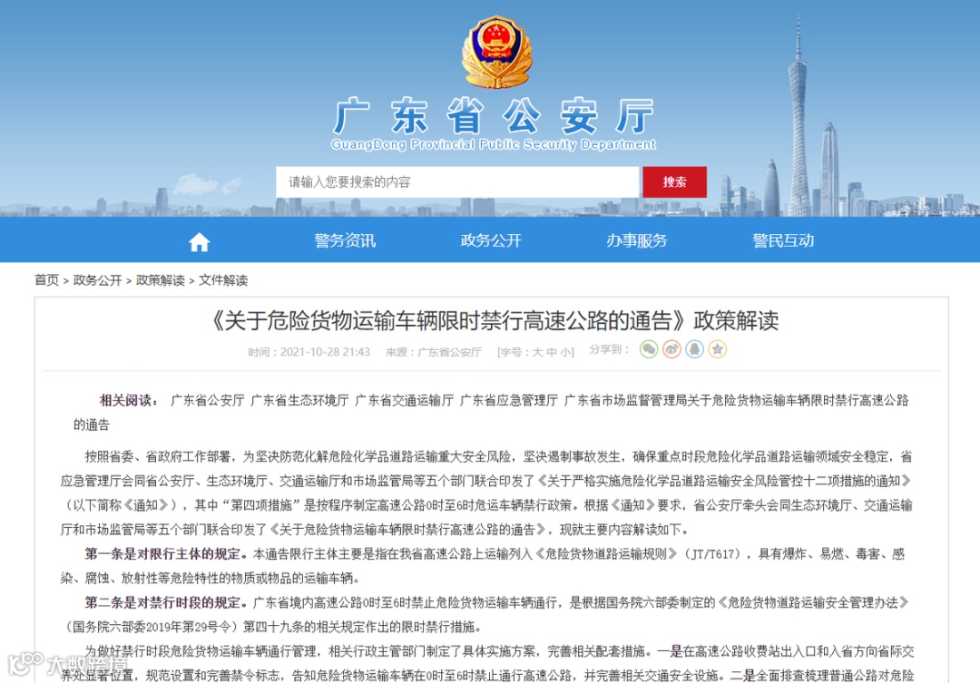 据广东省运输厅的消息,自11月1日起,广东省境内高速公路0点到6点禁止危险货物运输车辆通行,有效期为5年,前三个月为执法过渡期。