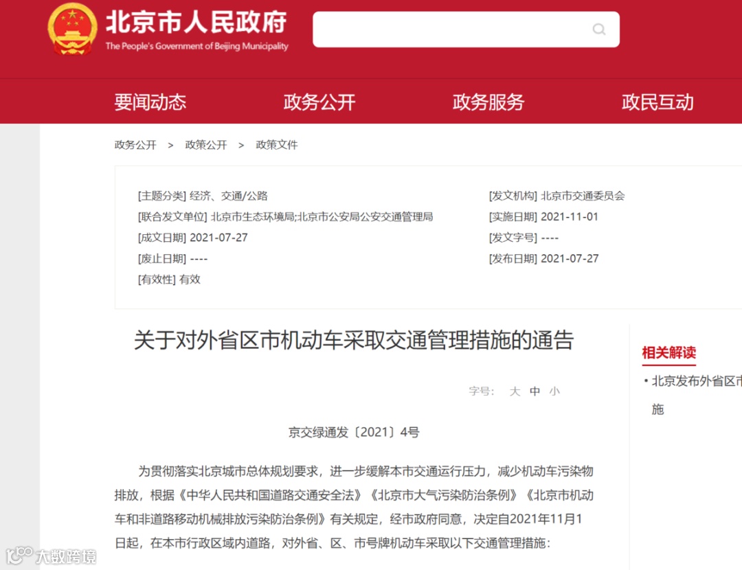 2021年11月1日起,普通外埠号牌车辆禁止驶入二环路(含)以内区域。以前进入六环路以内才需办理进京证的车辆,11月1日起,只要进入北京市区域内,即需办证。