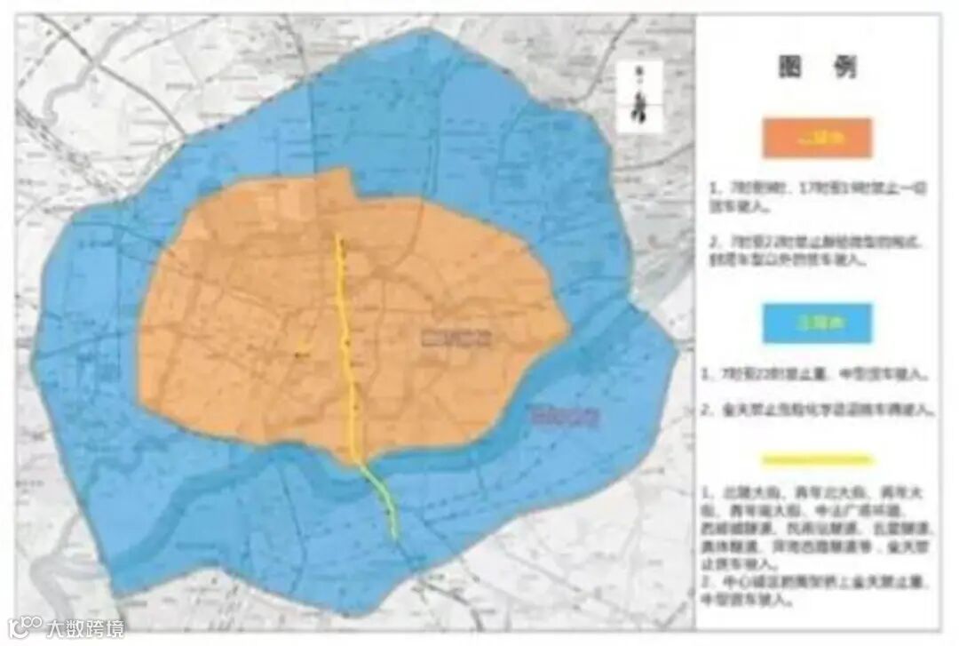 中心城区的高架桥上全天禁止重、中型货车驶入;二环区域内道路(含二环路):7时至9时、17时至19时禁止一切货车驶入;