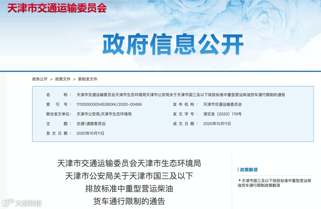 天津市交通运输委员会、天津市生态环境局、天津市公安局三部门联合发布通告表示: