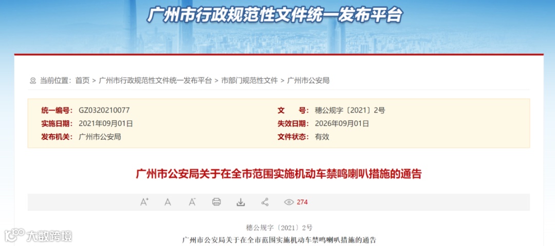 9月1日起,《广州市公安局关于在全市范围实施机动车禁鸣喇叭措施的通告》实施,全市范围所有道路全天禁鸣喇叭,该《通告》有效期5年。