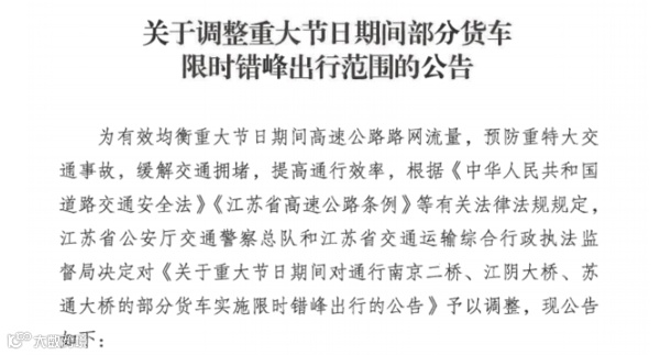 江苏省公安厅交通警察总队和江苏省交通运输综合行政执法监督局决定对《关于重大节日期间对通行南京二桥、江阴大桥、苏通大桥的部分货车实施限时错峰出行的公告》予以调整。