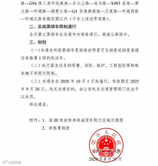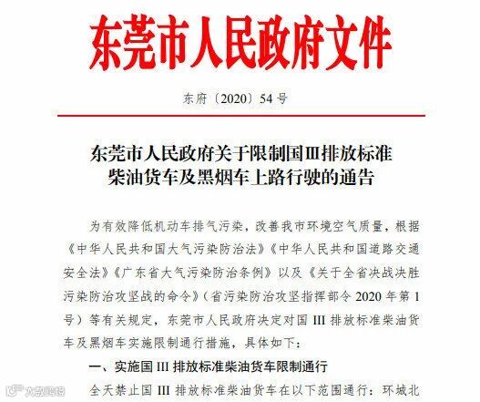 东莞市政府发布正式通告:限制国三柴油货车及黑烟车上路行驶!限行政策于10月1日正式实施,有效期至2025年9月30日。