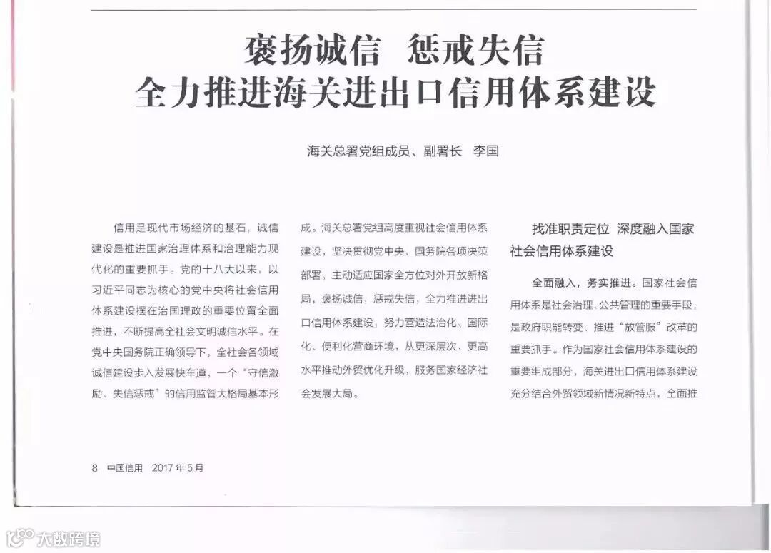《中国信用》杂志(2017年第5期)刊登了海关总署党组成员、副署长李国署名文章《褒扬诚信 惩戒失信 全力推进海关进出口信用体系建设》。文章从5大方面阐述了海关在进出口信用体系建设方面取得的成果:找准职责定位,深度融入国家社会信用体系建设;强化履职担当,扎实开展进出口企业信用管理;深化通关改革,构建以信用为核心的新型海关监管体制;注重诚信培育,密切关企互信合作伙伴关系;扩大国际合作,提升海关信用体系建设国际影响力。