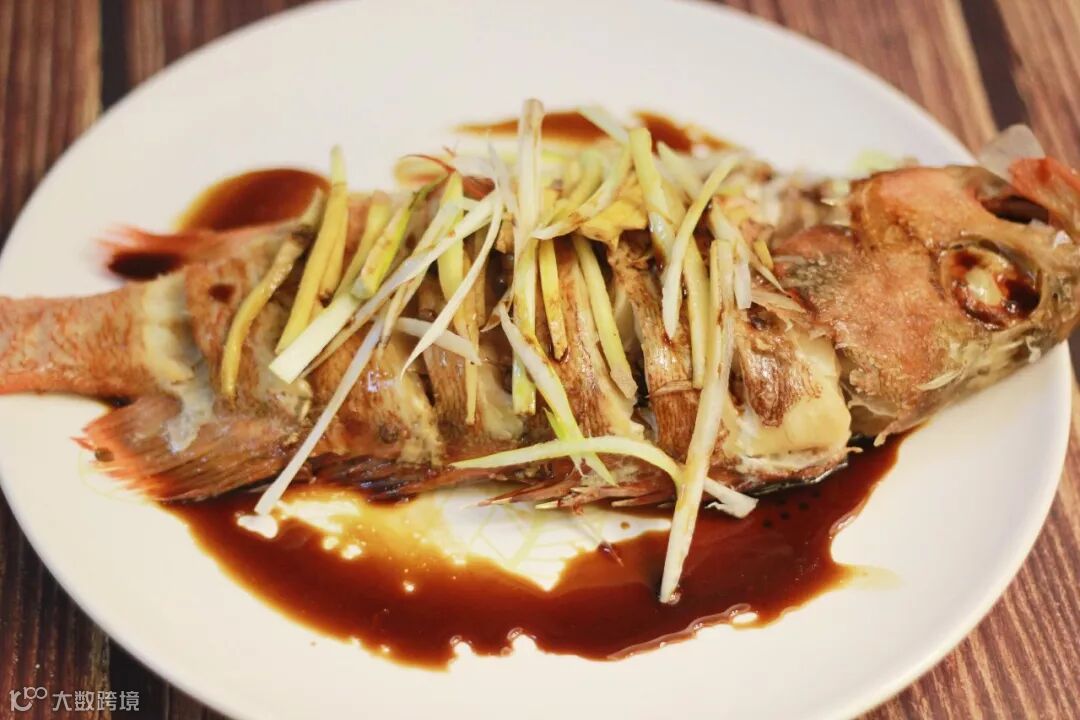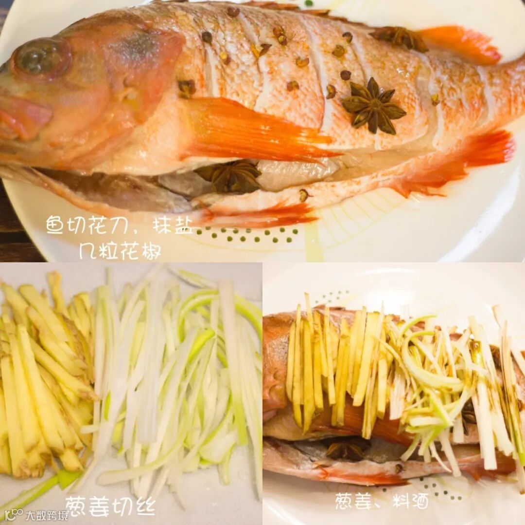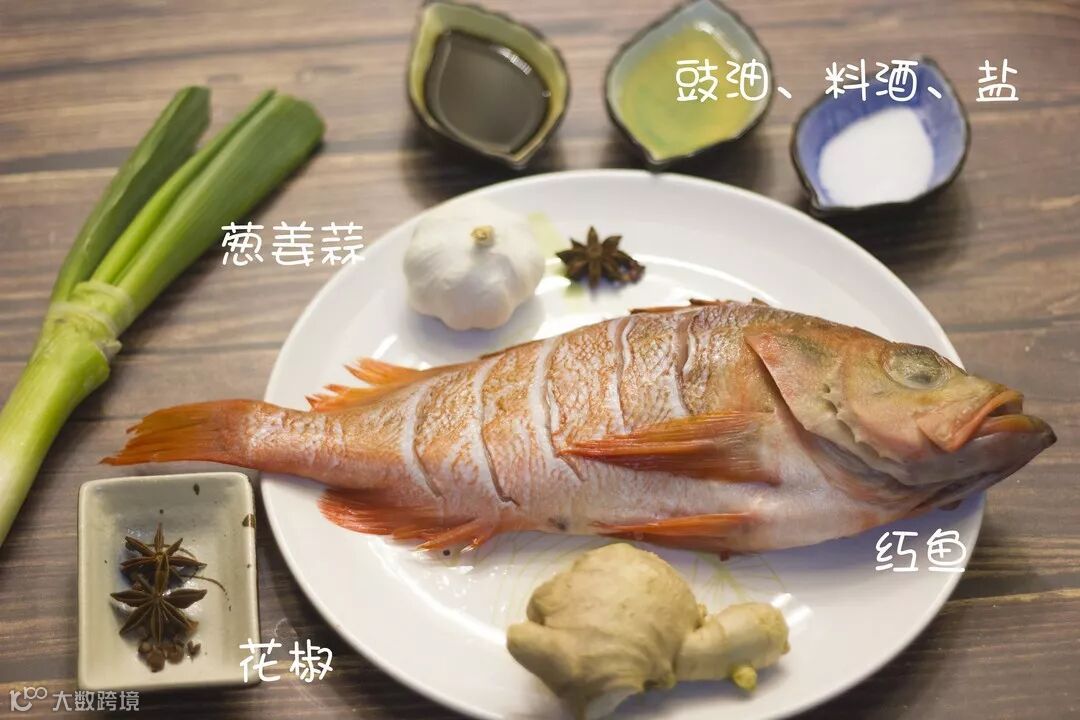 准备所需食材,准备豉油、料酒、盐,葱、姜、蒜、八角,冰岛红鱼洗净。