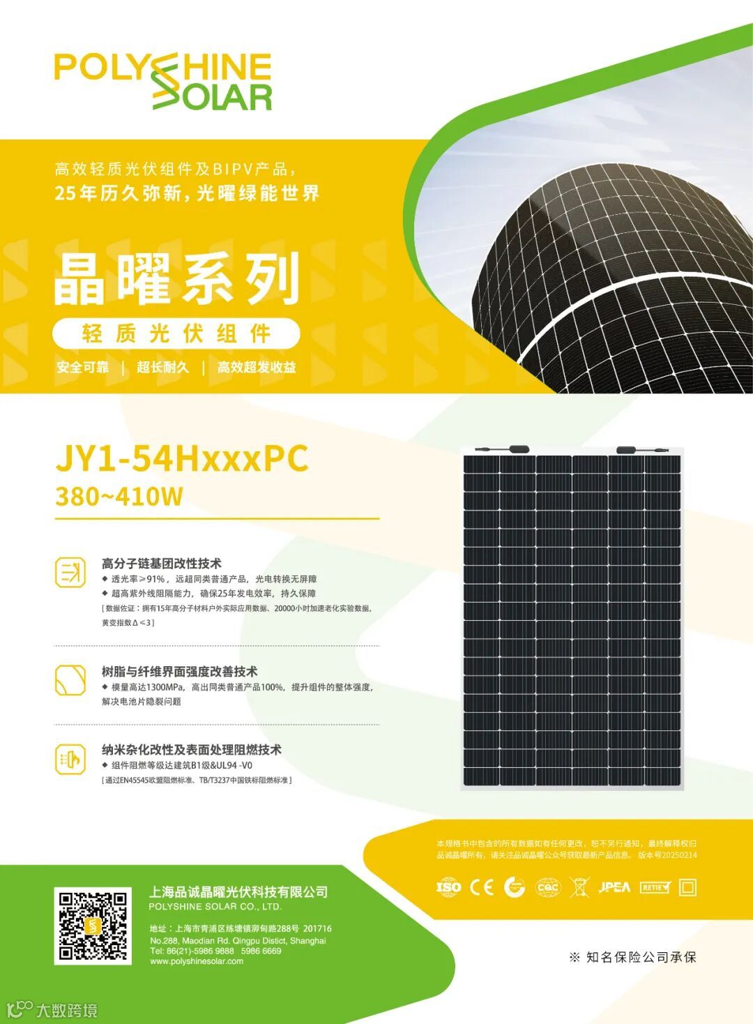 上海品诚晶曜光伏科技有限公司(Polyshine Solar)是一家集轻质光伏组件研发、生产、销售于一体的创新型科技企业。