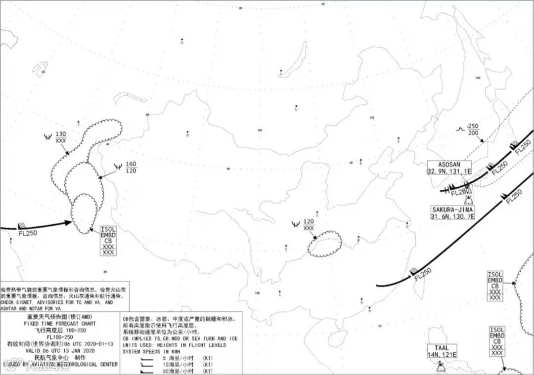 这是在10000~25000英尺之间全国重要天气图,但是在某一个时刻,这个预报被修订为: