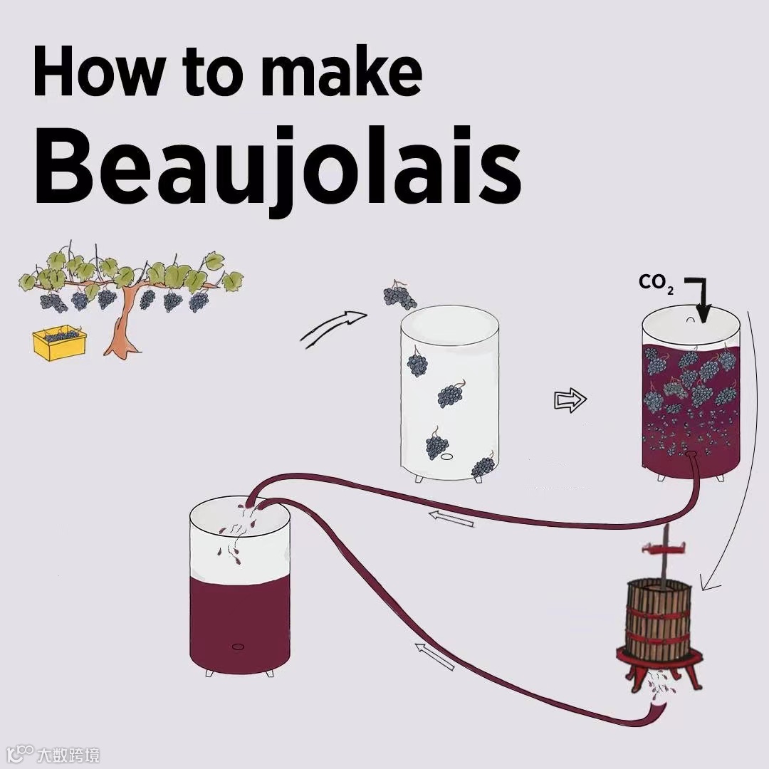 博若莱新酒是所有葡萄酒中是所有葡萄酒中唯一的一款当年采摘、当年酿制、当年上市的红葡萄酒。酿酒的葡萄为当年 8、9 月份采摘,到 11 月份即开瓶饮用,总共酿造时间不过2 个多月。不同于其他葡萄酒酿造前需要对采摘下来的葡萄进行去梗、破皮……博若莱新酒是将整串葡萄直接丢进充满了二氧化碳气体的发酵罐中,在缺氧的情况下,每一粒葡萄果实在葡萄皮的保护下慢慢绽放出浓郁的果香与美好。