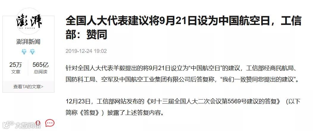 12月24日,工信部在对十三届全国人大二次会议第5569号建议进行答复时披露,工信部将会同有关单位加快启动“中国航空日”的会商、报批程序。