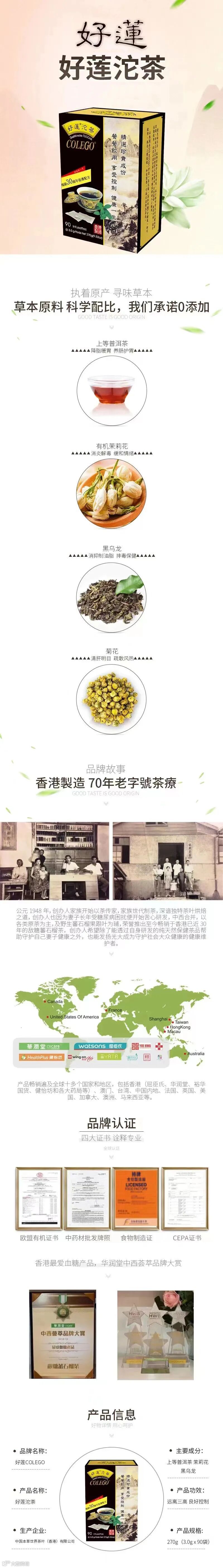 好莲沱茶调味茶,精选上等普洱,配以有机茉莉花、黑乌龙、菊花、杜仲叶、银杏叶等草本为原料,按照香港70年老字号茶疗的古法配方秘制而成,是一款纯天然、0添加的保健茶。无论你是三高人群、亚健康人群、爱美人士,这款茶品都能带给您带来健康和惊喜。