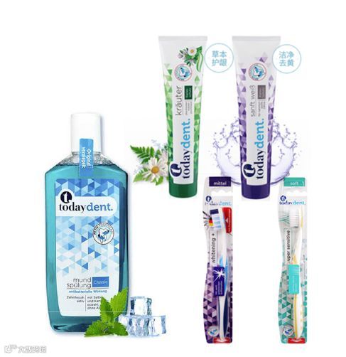 Today牙刷,不含双酚A,特别柔软光滑的刷毛给您敏感的牙齿和牙龈最大限度地提供了保护。通过短头能够同时清洁到平时难以触及的牙齿区域。礼包内还配备了不含酒精成份的爽洁漱口水,让您在饭后睡前都有一口清馨的口气,360度保护您的口腔。