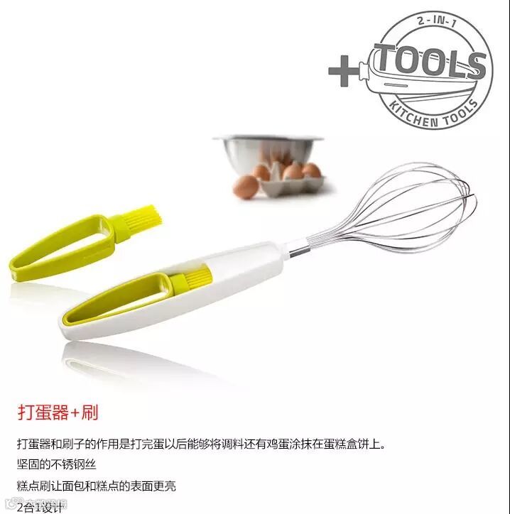 这款打蛋器是用一个圆形的球状和坚固的不锈钢材质制成。符合人体工程学的打蛋器手柄,打蛋轻松方便不易手酸。隐藏在打蛋器手柄的小刷子刷头是用食用级塑料的材质,健康而且很便捷。这样蛋糕表面上涂抹蛋酱,糕点酱或油脂烤盘或平底锅,非常方便,绝对是您厨房必备的糕点好帮手。