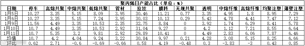 进入一月份,伴随春节假期临近,聚丙烯下游行业平均开工负荷呈持续下滑走势。据监测,本周国内聚丙烯下游行业(含塑编、注塑、BOPP、PP无纺布)整体开工率下滑3.8%至50.9%。其中塑编开工率下滑0.5%至43.5%;注塑开工率下滑8%至49%;BOPP开工率下滑0.7%至62.9%;无纺布开工率下跌5.8%至48.3%。