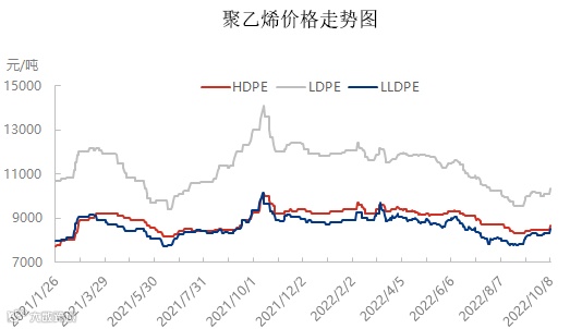 库存方面,截至2022年10月8日,中国聚乙烯生产企业样本库存量:47.36万吨,较上期涨9.65万吨,环比涨25.59%,库存趋势由跌转涨。主要因为国庆节假期,生产企业多停销结算,市场成交也接近停滞,资源消化放缓明显;其次因为临时停车多已开车,供应增加明显。综上所述,在供应增加明显、需求下滑明显下,市场资源消化减慢,生产企业库存上涨幅度较大。