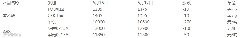 2、周五苯乙烯华东市场跌270元/吨收10630元/吨,华南跌200元/吨收10800元/吨,山东跌150元/吨收10875元/吨。
