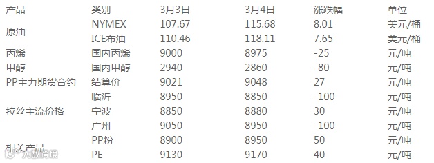 3、市场分析及预测:期货高位整理,对现货市场仍有支撑。地缘政治因素,国际原油盘间大幅上涨,成本支撑持续走强、石化出厂价格仍有上涨预期。中间商报盘成本增加,市场炒作气氛升温。预计今日现货市场报盘上涨为主,华东拉丝主流在9000-9300元。